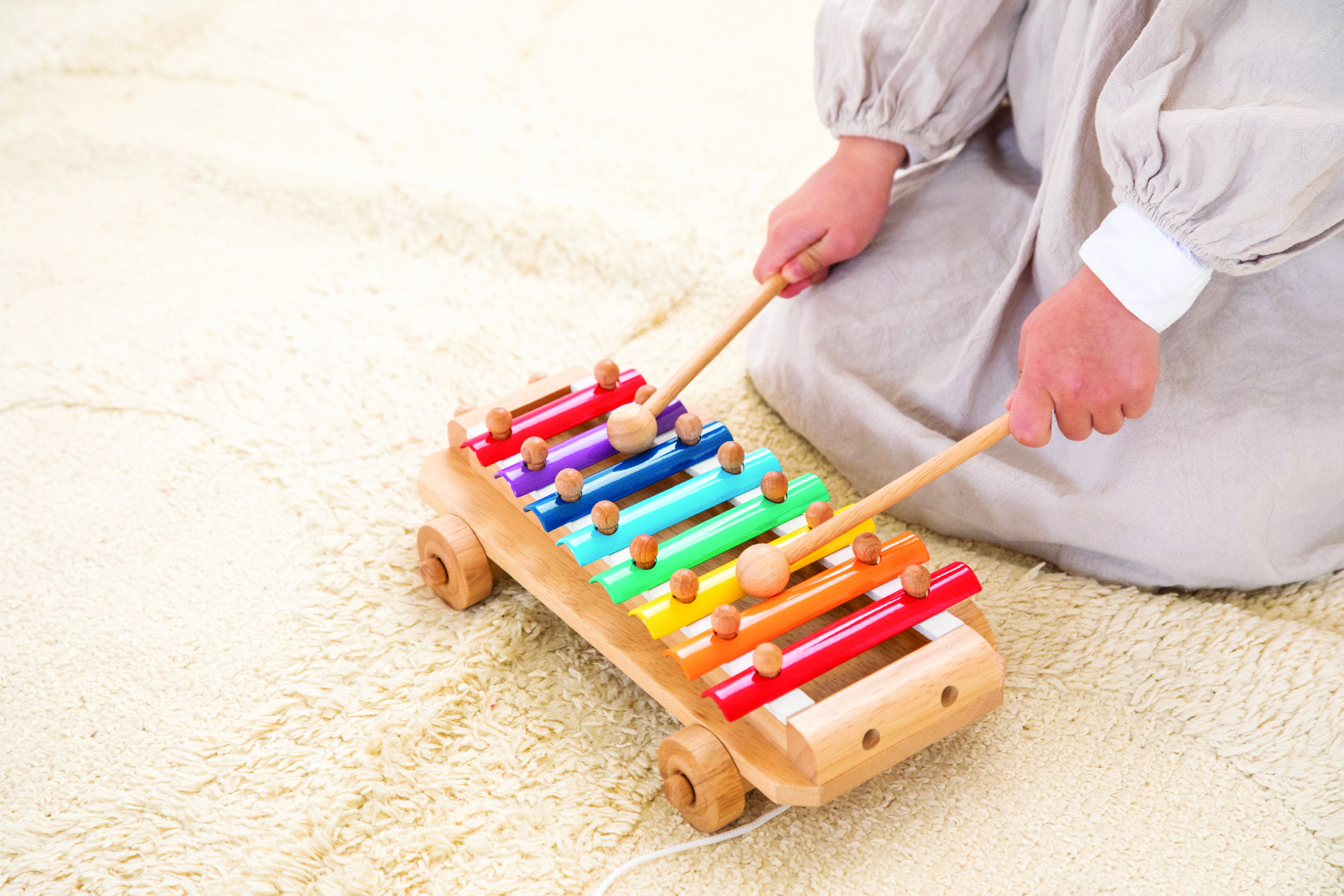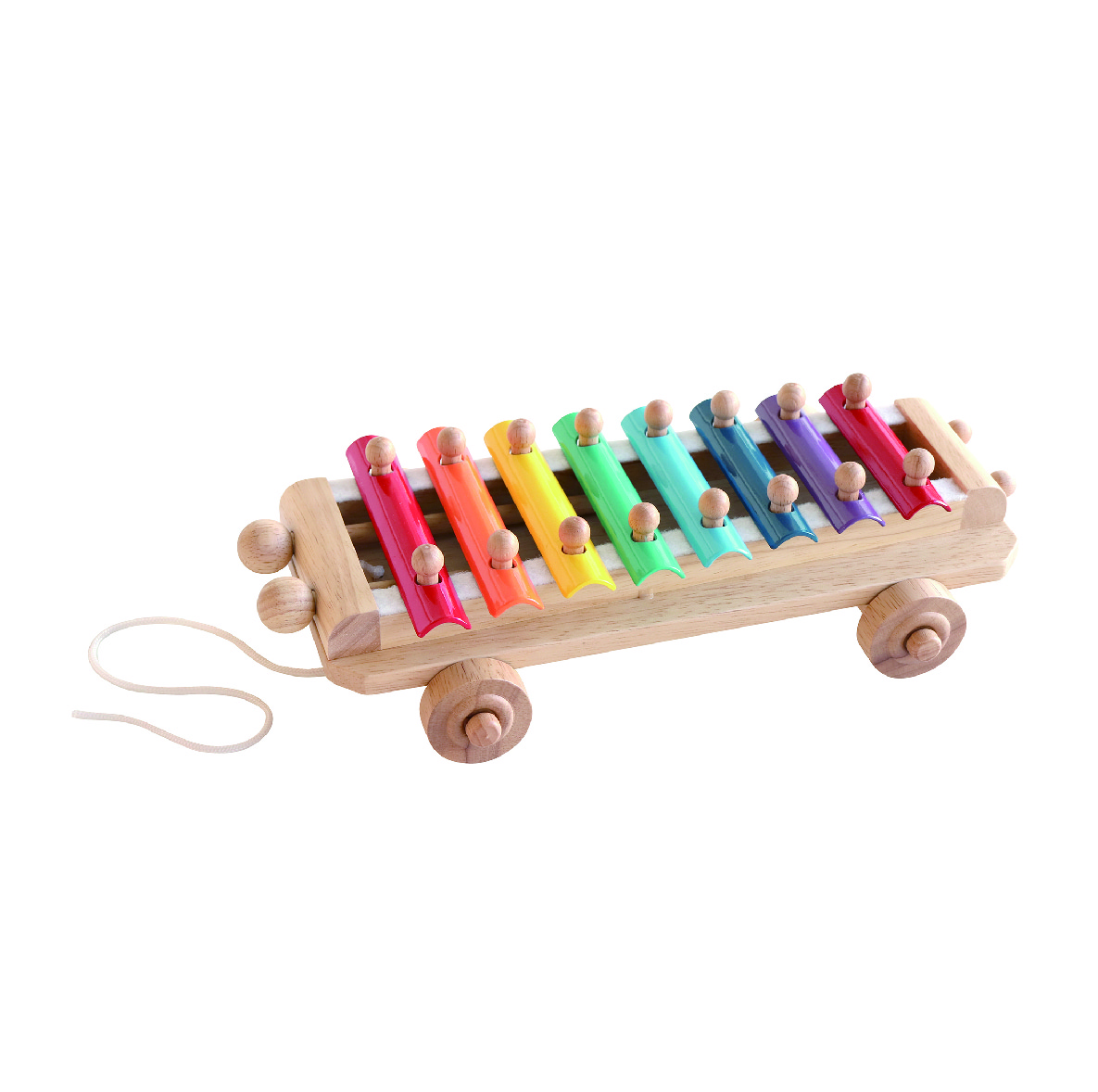 A xylophone with a pleasant tone that sparks children’s curiosity as they pull, tap, and explore sounds. This toy lets children enjoy making sound, but since it’s not a musical instrument, it is not tuned.