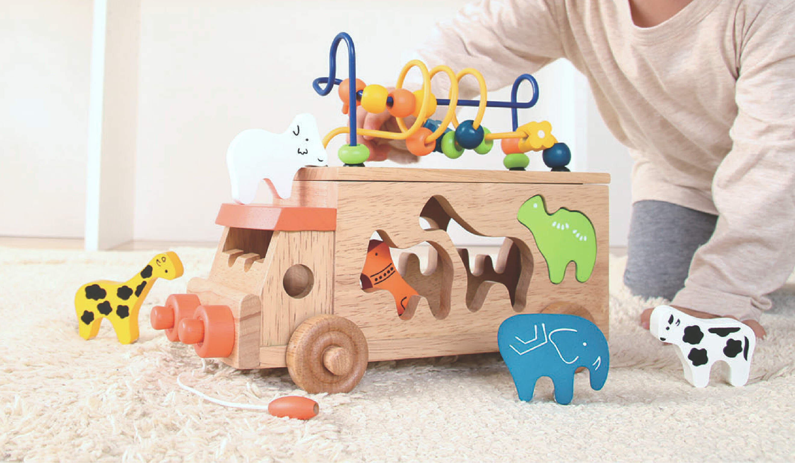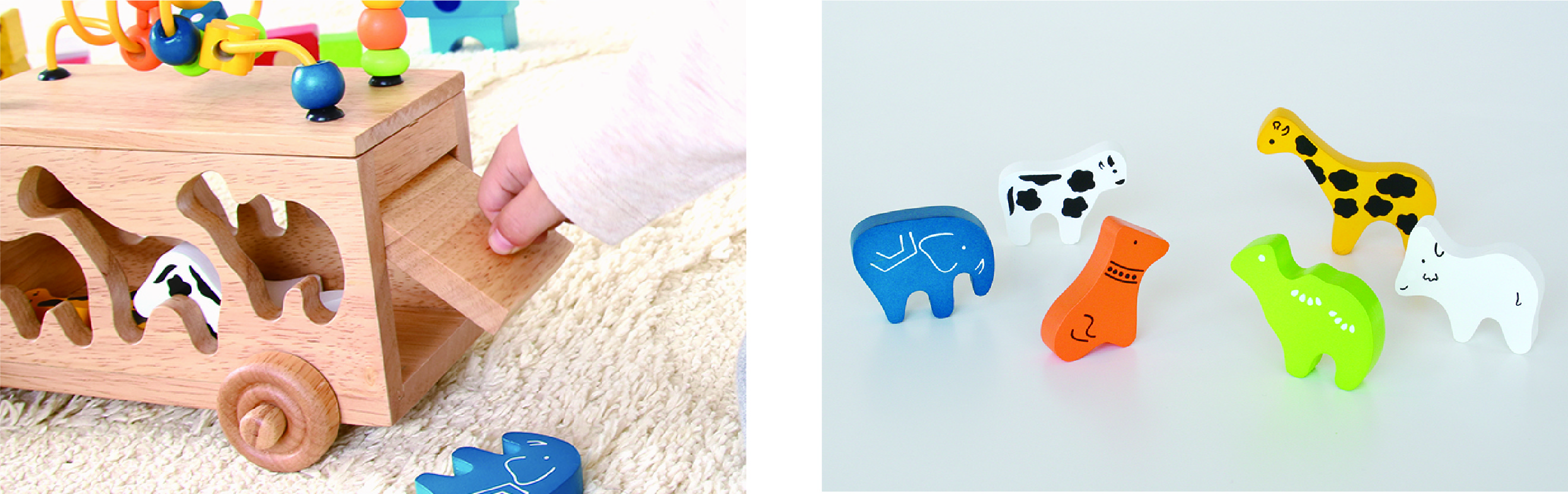 A high-quality pull toy that doubles as an animal-shaped puzzle! Using their hands, children can match the six animal blocks—goat, giraffe, turtle, dog, cow, and elephant—to the corresponding silhouette holes. This engaging toy helps develop dexterity and concentration.